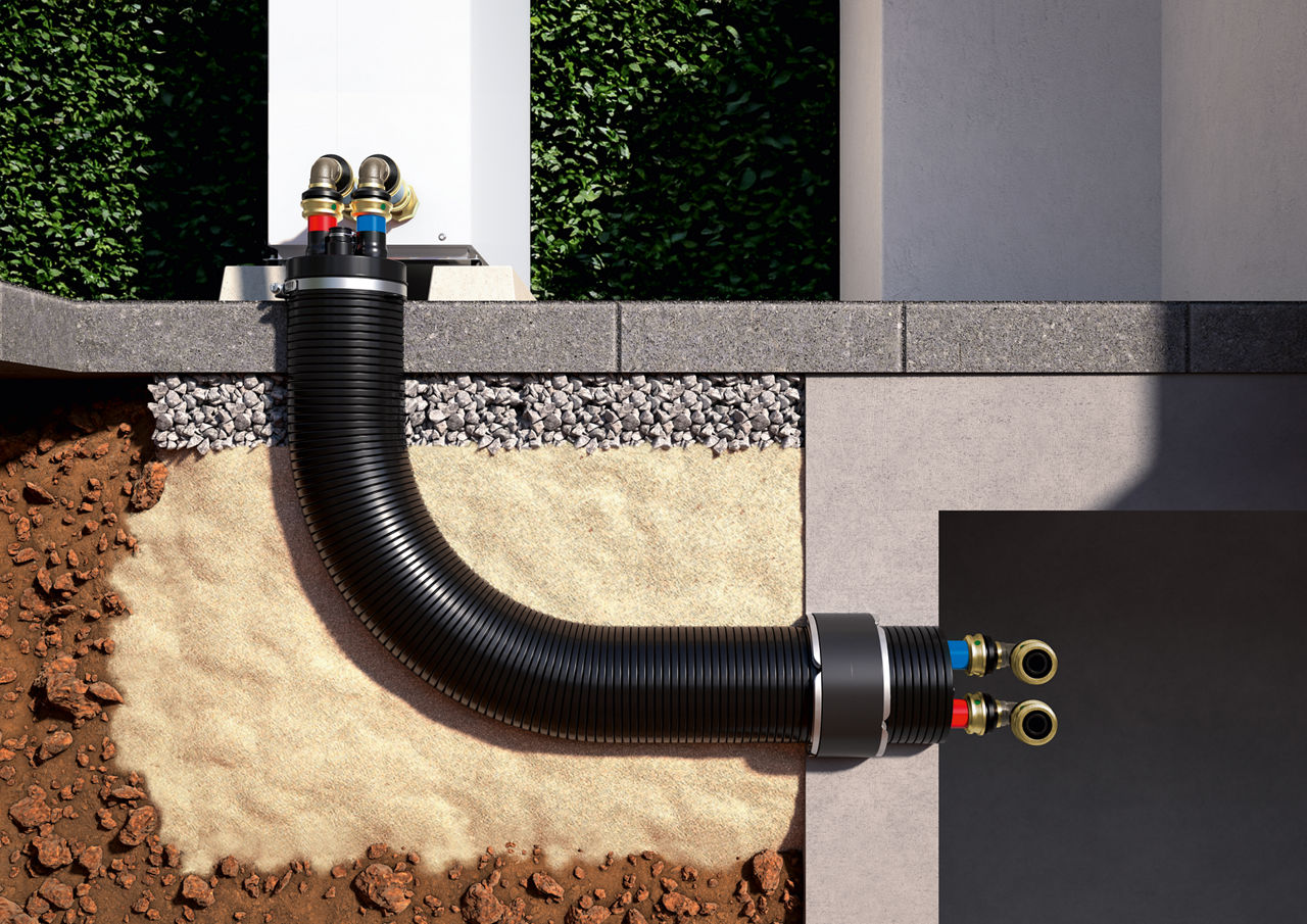 - Einfache Leitungsführung im Erdreich: Für die erdverlegte Installation steht ein speziell abgestimmtes Wärmepumpenanschlussrohr zur Verfügung. Es erlaubt eine durchgängige Pressverbindung bis in den Technikraum, reduziert Schnittstellen und erleichtert die Montage im Erdreich.