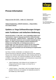 Durch regelmäßige Updates passt Systemanbieter Viega die zielgruppenspezifischen Softwarelösungen „Viptool Engineering“, „LINEAR Solutions – Viega Edition“ und „Viptool Master“ den aktuellen technischen und normativen Entwicklungen des Marktes an. Zudem spielt die möglichst einfache Handhabung der Software eine wichtige Rolle, um Arbeitsprozesse weiter zu beschleunigen. Das zeigen besonders deutlich die jetzt vorgestellten Updates 2025. Neben neu plazierten Funktionen für eine intuitive Bedienung wurde zum Beispiel auch die Darstellung der Eingabemasken neu gestaltet.