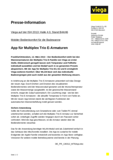 Der Bedienkomfort steht bei den Wannenarmaturen der Multiplex Trio E-Familie von Viega an erster Stelle. Elektronisch geregelt lassen sich Temperatur und Füllhöhe individuell auswählen und bei Bedarf auch in so genannten Presets abspeichern. Mit der App für Multiplex Trio E3, E2 und E ermöglicht Viega weiteren Komfort: Über WLAN lässt sich das individuelle Badevergnügen jetzt auch mobil aus der gesamten Wohnung steuern.