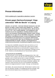 Nicht über fehlenden Nachwuchs in der SHK-Branche nur klagen, sondern konkret etwas dagegen tun – mit dieser Überzeugung unterstützt Viega die Durchführung der „WM der Berufe“, die vom 2. bis 7. Juli in Leipzig stattfindet. „Die Ausbildung im SHK-Handwerk muss für die Jugendlichen unbedingt attraktiver werden, wenn wir den drohenden Fachkräftemangel verhindern wollen. Deshalb engagieren wir uns gerne für die `WorldSkills Leipzig 2013´“, beschreibt Dirk Gellisch, Geschäftsbereichsleiter Vertrieb und Marketing bei Viega die Motivation für das Sponsoring. Als so genannter Skill-Presenter sorgt der Systemhersteller dafür, dass die Wettbewerbe im Berufsbild Anlagenmechaniker für Sanitär-, Heizungs- und Klimatechnik mit entsprechend professioneller Ausstattung durchgeführt werden können.