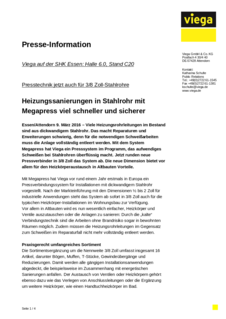 Mit Megapress hat Viega vor rund einem Jahr erstmals in Europa ein Pressverbindungssystem für Installationen mit dickwandigem Stahlrohr vorgestellt. Nach der Markteinführung mit den Dimensionen ½ bis 2 Zoll für industrielle Anwendungen steht das System ab sofort in 3/8 Zoll auch für die typischen Heizkörper-Installationen im Wohnungsbau zur Verfügung.