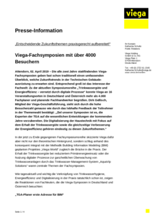 In der jetzt zu Ende gegangenen Fachsymposiumsreihe skizzierte Viega dafür aber nicht nur den theoretischen Hintergrund, sondern schlug anhand des konsequent integral mit der Methodik Building Information Modeling (BIM) geplanten Projektes „Viega World“ zugleich die Brücke in die Praxis. Der Erhalt der Trinkwassergüte bei reduziertem Primärenergieeinsatz oder die Nutzung digitaler Prozesse zur ganzheitlichen Überwachung von Trinkwasseranlagen durch das Trinkwasser-Management-System „AquaVip Solutions“ waren zentrale Themen der Fachsymposien.