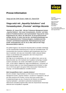 Mit dem Trinkwasser-Management-System „AquaVip Solutions“, dem neuen Vorwandsystem „Prevista“ und vielen weiteren Produktinnovationen setzt Systemanbieter Viega auf der ersten Regionalmesse des Jahres, der SHK Essen, für die gesamte Branche wichtige Akzente. Zu sehen sind die Neu- und Weiterentwicklungen aus den Kompetenzbereichen Trinkwasserhygiene, Installationstechnik, Vorwand- und Entwässerungstechnik, Flächentemperierung sowie Schall- und Brandschutz vom 10. bis 13. März 2020 auf dem Viega-Messestand (E04) in Halle 6.0.