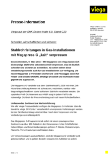Mit dem Rohrleitungssystem Megapress hat Viega als erster Hersteller alle Vorteile der schnellen Presstechnik auf Installationen mit dickwandigen Stahlrohren übertragen. Das Programm in den Dimensionen von 3/8 bis 2 Zoll umfasst alle wesentlichen Installationskomponenten, die für die Anbindung von Heizkörpern sowie Stahlrohr-Installationen in Heizungs- und Kühlanlagen sowie in industriellen Anwendungen beispielsweise für Druckluft, aber auch in Feuerlösch- und Sprinkleranlagen notwendig sind. Mit den neuen Megapress-Verbindern für Gas-Installationen rundet Viega das Pressverbindersystem für dickwandige Stahlrohre jetzt sinnvoll ab.