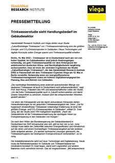 Trinkwasser ist in Deutschland nach wie vor von hoher Qualität. Im Gebäudesektor sind jedoch Anstrengungen notwendig, um gute Trinkwasserqualität vor dem Hintergrund der ambitionierten deutschen Klima- und Nachhaltigkeitsziele langfristig sicherzustellen. Dies ist eines der zentralen Ergebnisse der Studie „Zukunftsstrategie Trinkwasser“, die das Handelsblatt Research Institute (HRI) in Patenschaft mit dem Trinkwasser-Experten Viega am 12. Mai in Berlin vorstellte. Notwendig seien ein energieeffizienteres Trinkwassermanagement sowie ein höherer Digitalisierungsgrad bei Planung, Bau und Betrieb von Gebäuden.