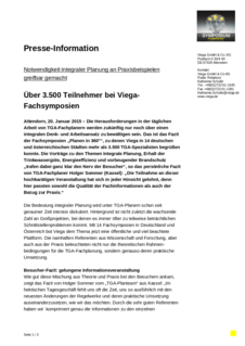 Dirk Gellisch, Mitglied der Viega-Geschäftsleitung, sieht das Konzept der Viega Fachsymposien durch die vielen positiven Reaktionen und die große Teilnehmernachfrage bestätigt: „Durch die bewusste Mischung aus theoretischen Grundlagen und Umsetzungsbeispielen für den Alltag ist es uns gelungen, das Thema `Integrale Planung´ für den Fachplaner verständlich und greifbar zu machen.“