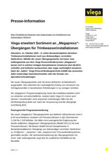 ½ Zoll bis 2 Zoll lieferbar. Sie bilden eine praxisgerechte Ergänzung des bereits etablierten „Megapress“-Übergangsstücks (Modell 4213.2) mit zwei Pressanschlüssen. Mit diesem Modell können beispielsweise in Bestandsinstallationen Übergänge von dickwandigen verzinkten Stahlrohren zu „Profipress“-, „Sanpress“- oder „Sanpress Inox“-Pressverbindersystemen geschaffen werden. Die Sortimentserweiterung der Übergangsstücke mit Innen- oder Außengewinde sorgt also für zusätzliche Flexibilität auf der Baustelle.