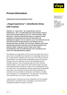 Nur wenige Wochen nach der Weltleitmesse „ISH“ in Frankfurt/Main geht Systemanbieter Viega ab April mit einer großen Roadshow auf Tour. Unter dem Motto „Viega Experience“ verspricht Viega den Besuchern an insgesamt sieben Standorten in Deutschland und Österreich Information und Entertainment zugleich: Vom 22. April bis zum 10. Juni 2015 darf sich die SHK-Welt zwischen Hamburg, München und Salzburg auf eine faszinierende Show aus Musik und Tanz freuen. Experten werden über aktuelle Branchenthemen informieren und die Messeneuheiten sind hautnah erlebbar. Insgesamt erwartet Viega zu den sieben Veranstaltungen mehr als 10.000 Besucher. Eine Anmeldung ist ab sofort unter viega.de/Roadshow möglich.